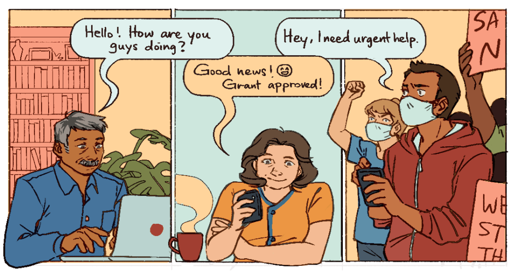 The carekit covers aspects of collective digital care for campaigners over the journey of standing up for a cause, from forming online communities, maintaining these spaces, keeping them safe and celebrating these communities. We highlight, from the outset and throughout, the importance of strategically modelling mutually supportive, generous and collaborative ways of organising online, to resist replicating the discrimination, exploitation and exclusions already rampant in digital spaces. We also suggest that practices of shared learning and working together through the messiness of online activism is key to the collective process, since “We do not get there from here by ignoring all of the mud in-between those positions”.[4] Cross-pollination drawing on the connective possibilities of the digital, e.g., reaching out to experienced allies for advice, should be firm parts of the communities of care we build and the pedagoges of activism we develop.